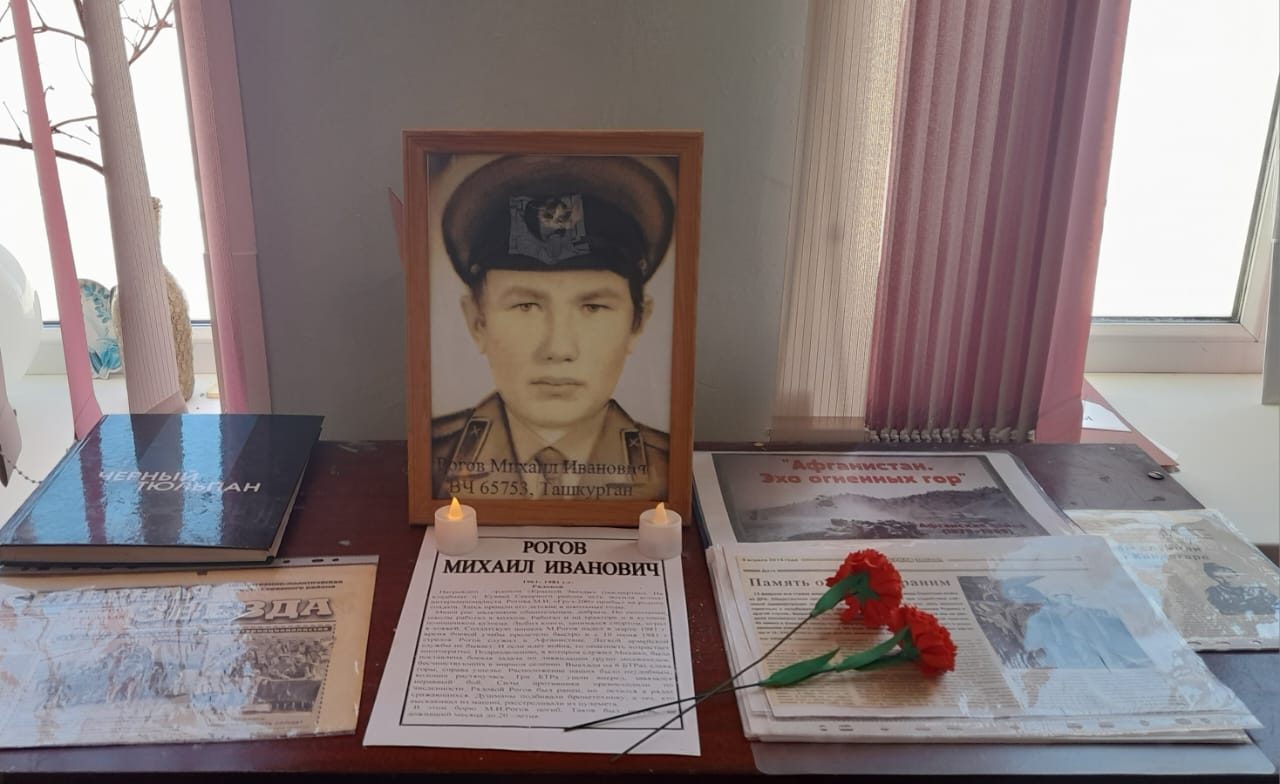 Библиотекарь Курско-Васильевской сельской библиотеки рассказала школьникам о мужестве, стойкости и героизме наших солдат, принимавших участие в военных событиях Афганистане, прочла стихотворения В.Заводчикова, познакомила с тематической выставкой «Наши земляки- воины интернационалисты». Среди них: Попов Ю.А., Давыдов А.А., Краснов В.И., Маликов М.К. Рогов Михаил Иванович награждён орденом «Красной звезды» (посмертно).