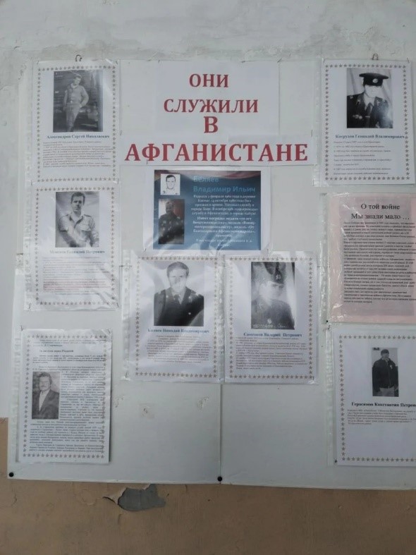 Тяжелая и изнурительная Афганская война длилась с 25 декабря 1979 года по 15 февраля 1989 года. Многие наши земляки лично принимали участие в боевых действиях в Афганистане. На выставке представлены их фотографии, биографические данные и награды. Выставка создана с целью патриотического воспитания подрастающего поколения и молодежи на примерах мужества, героизма, стойкости наших солдат и увековечивания памяти о трагических событиях, проходивших на территории Афганистана.