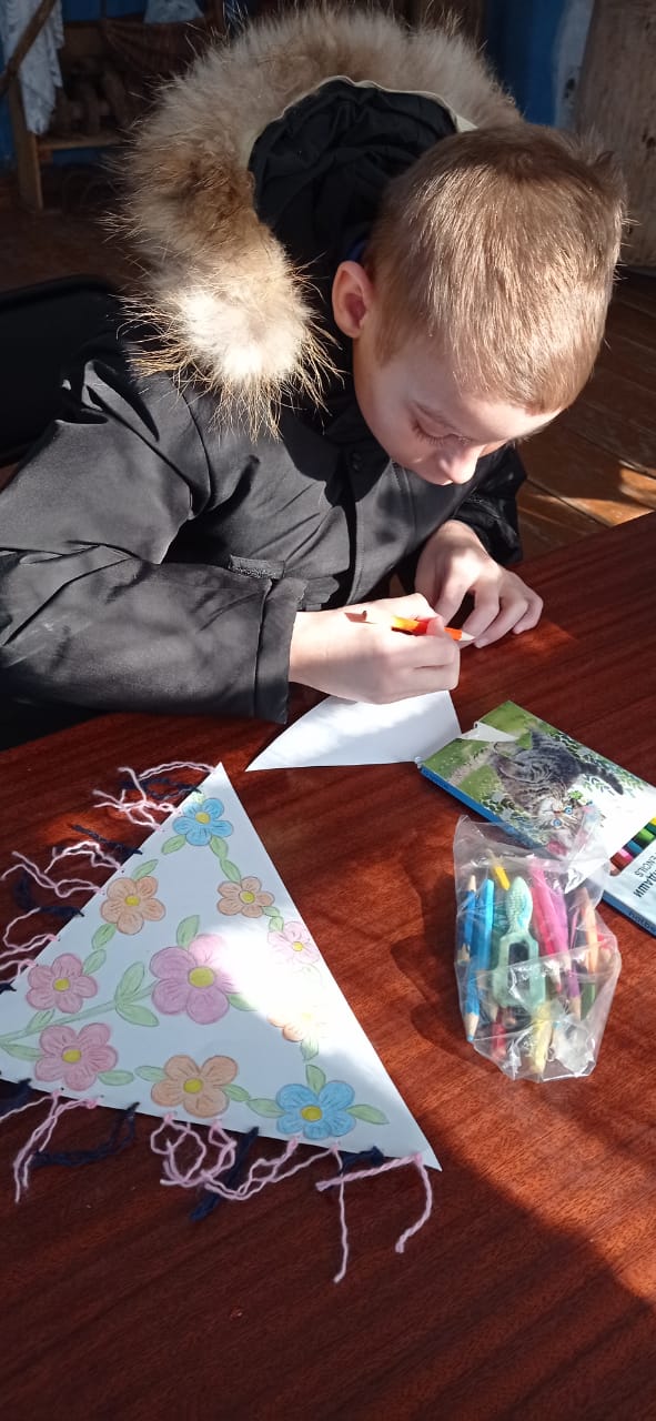 Мероприятие прошло в тёплой обстановке, В завершении, отгадав загадку - "Носят женщины, старушки, носят милые девчушки - к уголочку, уголок сложен красочный платок", дети сделали поделку "Платочек".
