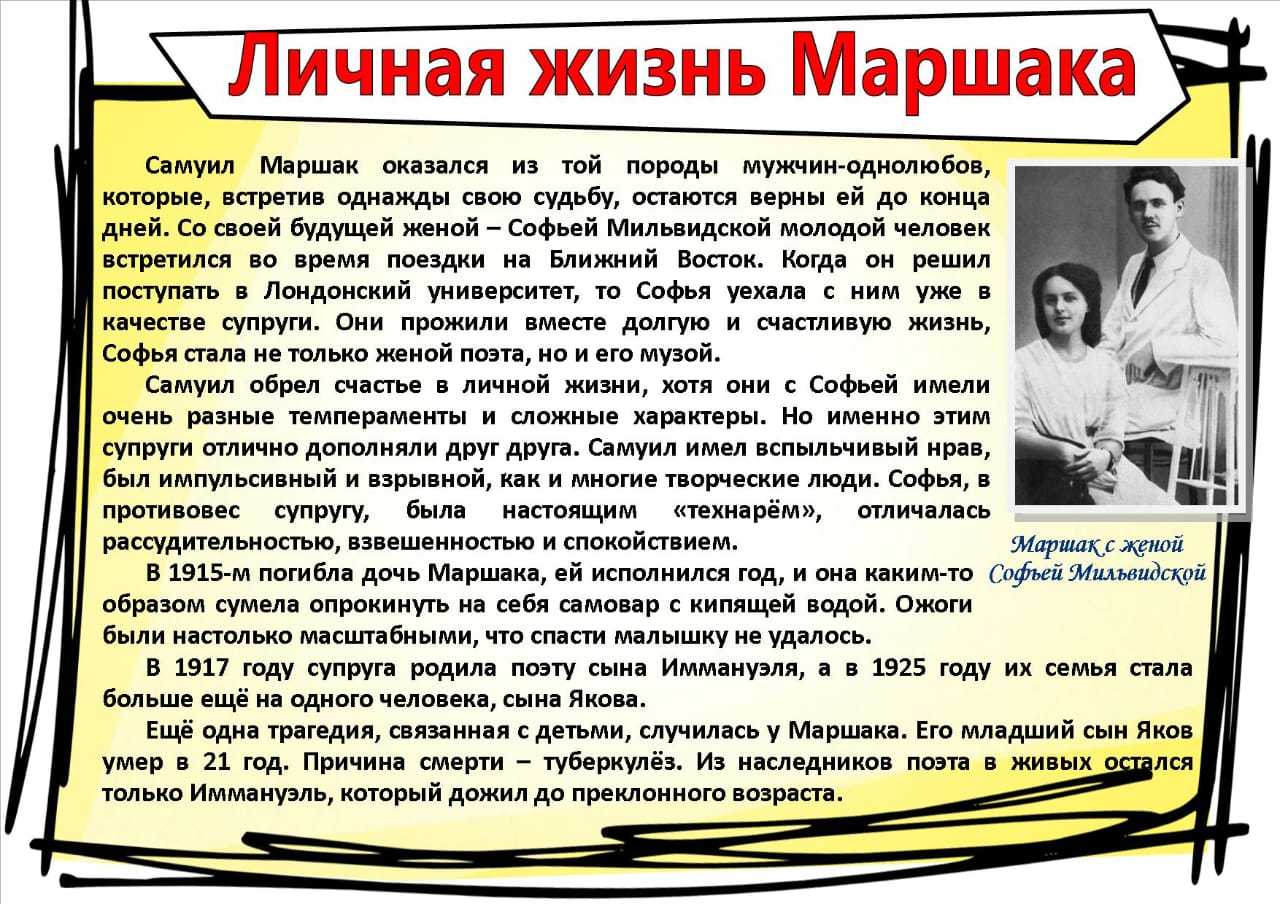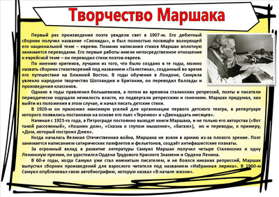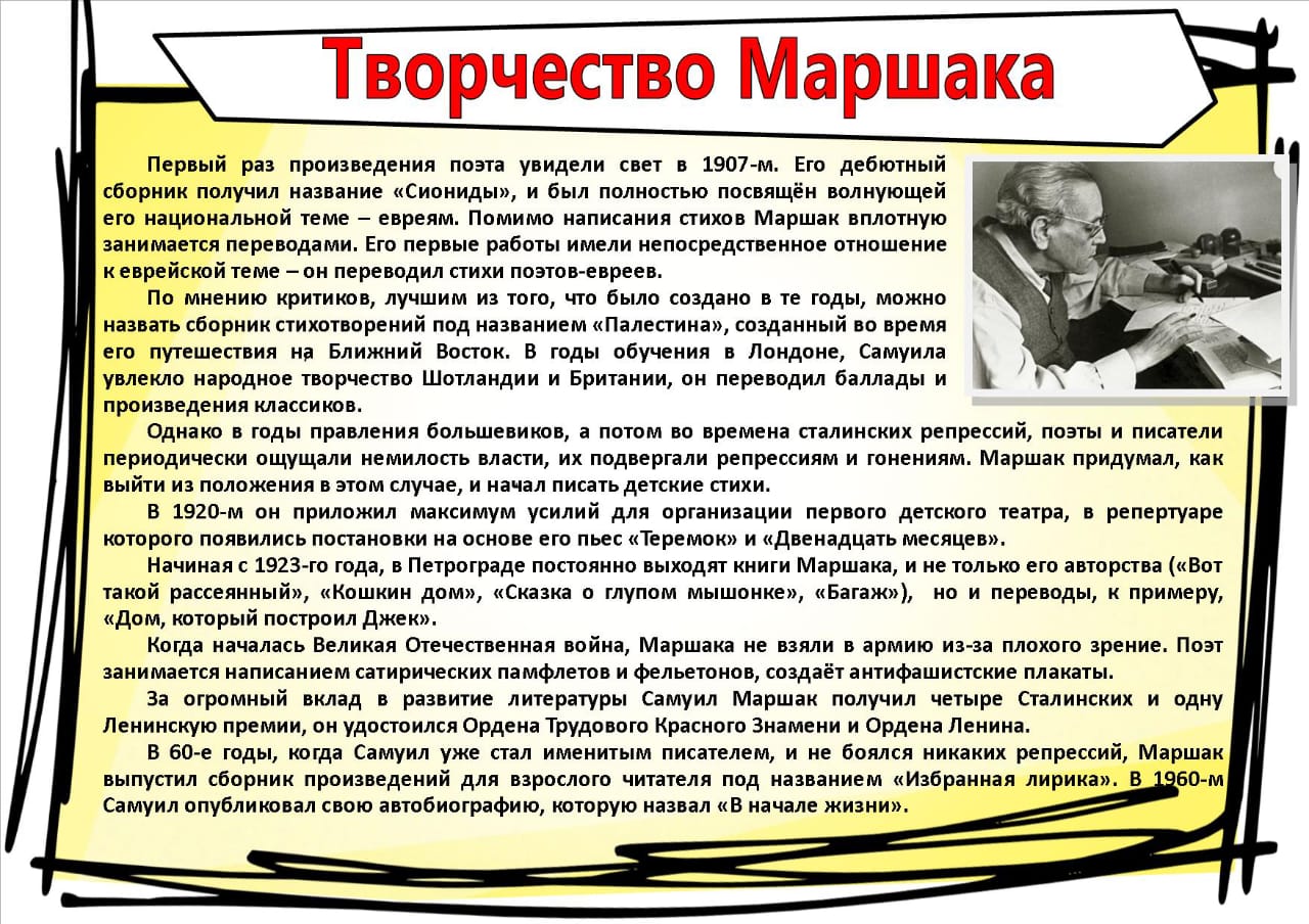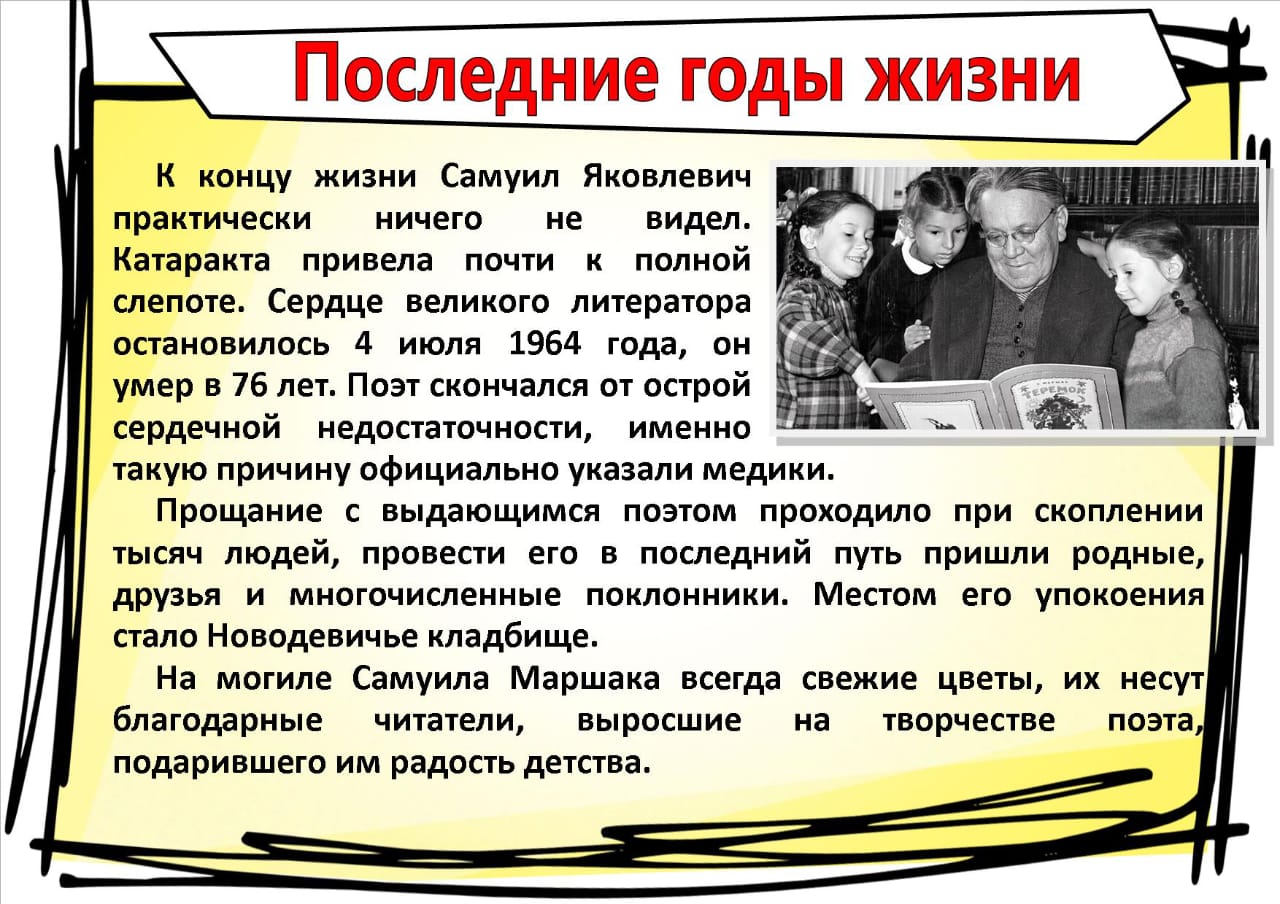 Маршак сделал много хорошего для детей. Он создавал для них театры, мастерские, помогал детям – сиротам. А сколько интересных сказок и стихов написал Самуил Яковлевич для детей! Не только вы, но и ваши дедушки и бабушки не представляли своего детства без сказок: «Кошкин дом», «Двенадцать месяцев», «Сказка о глупом мышонке».