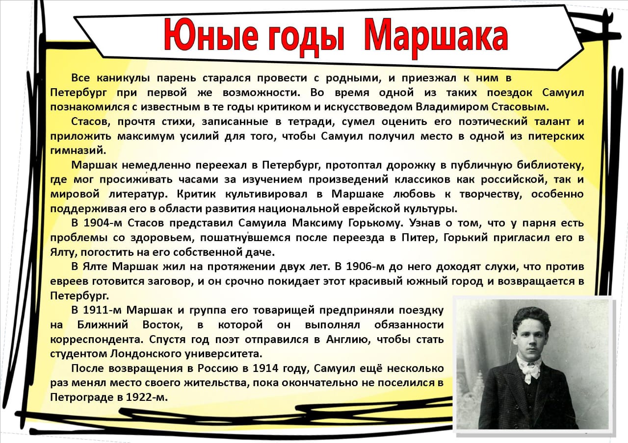 Сочинять стихи стал с 4х лет, а к 11 годам уже написал несколько длиннейших поэм и перевёл оду Горация. Любовь к классической поэзии Самуилу привил учитель словесности В.И.Теплых, который разглядел в нем талант. С великой благодарностью Маршак вспоминал своего учителя гимназии. В 1902 году одна из первых поэтических тетрадей Маршака попала в руки известного русского искусствоведа и критика В.В. Стасова, принявшего активное участие в судьбе юноши. Благодаря его хлопотам Маршака перевели в одну из лучших гимназий в Петербурге.