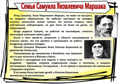 Отец Самуила Яковлевича очень любил книги, знал несколько иностранных языков. Мама занималась воспитанием своих шестерых детей.