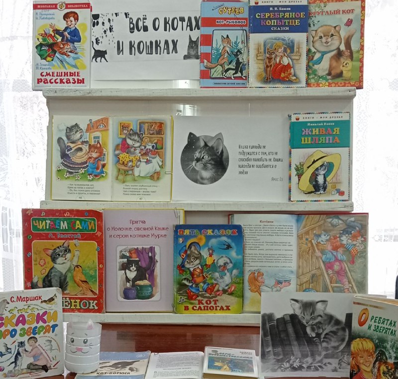 В рамках проекта по экологии в Русскокандызской библиотеке ко Дню кошек организовала для детей книжную выставку - инсталляцию "Всё о котах и кошках". На выставке представлены книги: Н. Носова "Живая шляпа", Л. Толстого "Котёнок", В. Сутеева "Кот рыболов", К. Паустовского "Кот ворюга" и другие, где литературными героями являются наши очаровательные любимцы - Кот в сапогах, кот Матроскин, кошка Муренка, кот Базилио, тётя Кошка. Также маленьких читателей ждут приятные встречи с кошками - путешественниками, кошками - волшебниками и просто хорошими друзьями.