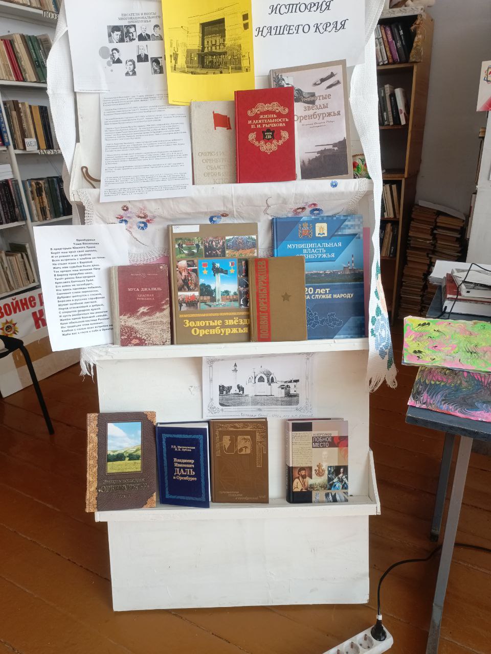В Новодомосейкинской библиотеке работает книжная выставка "Край мой - капелька России", где представлены книги об удивительном красивом Оренбургском крае, с его богатой разнообразной природой, историей и культурой, прославленные писатели и поэты. В ходе обзора выставки сотрудник библиотеки познакомила присутствующих с книгами: " Губернатор края", "Оренбуржье - край благословенный", " Герои Оренбуржья", И. Храмова, "Наши люди", «Оренбургский край: история и современность". Особое внимание было уделено произведениям наших земляков, которые сами сражались в Великой Отечественной войне, приближая Победу над фашизмом. Многообразие книг, представленных на выставке позволило рассказать библиотекарю об истории Оренбургского края, о выдающихся людях, чьи жизни и судьбы связаны с нашим краем, о Героях Оренбуржья, об удивительной и неповторимой красоте нашего края с его бесконечными просторами, о памятниках культуры и заповедных местах.