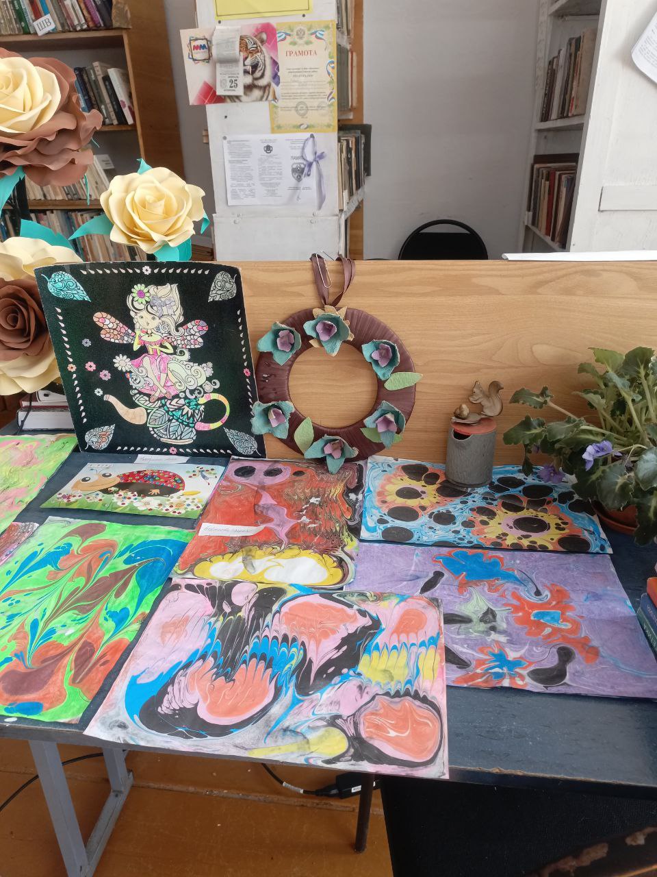 Дети представили свои интересные работы: картины, сделанные из бисера (Кузьмина Анна); рисунки (Борисовой Дарьей), сделанные в технике эбру, мраморинг - это древняя живопись на воде с дальнейшим переводом рисунка на лист бумаги, что очень удивило гостей, все аплодировали и благодарили за участие.