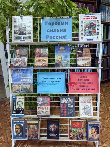 К этому событию в центральной районной библиотеке оформлена книжная выставка «Героями сильна Россия», на которой представлены книги о героях нашего Отечества с древних времен по настоящее время, которые прославили нашу Родину, и мы по праву ими гордимся. Также представлены альбомы «Память о героях нашего времени» (альбом посвящен памяти северян, погибших в СВО) и «Герои Великой Отечественной войны Северного района».