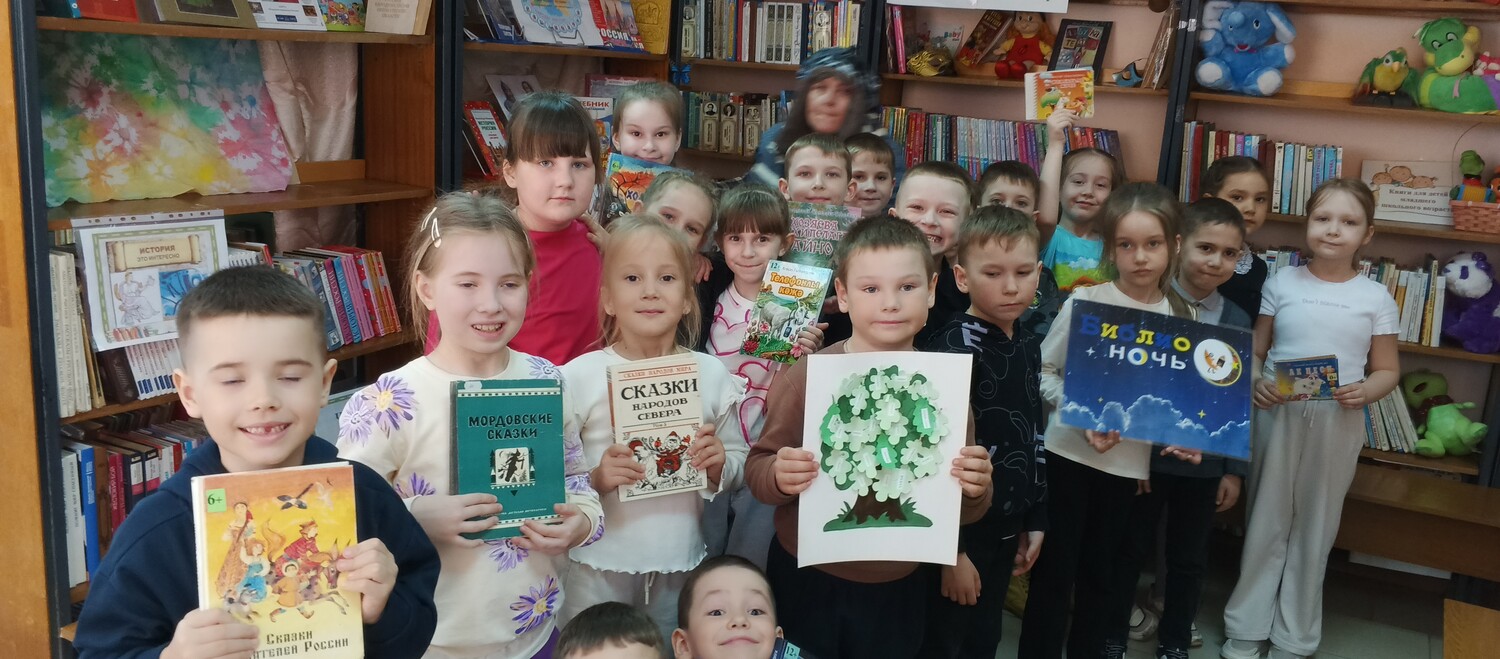 В рамках Всероссийской акции «Библионочь-2026» в детской районной библиотеке для юных читателей был проведен литературный час «Путешествие по сказам народов России». Юные гости отправились в путешествие по сказкам разных уголков России: от татарских историй до сказаний народов Севера. С помощью викторины «Знатоки сказок» школьники продемонстрировали свои познания в сюжетах русских народных сказок. В ходе мероприятия поиграли в чувашскую народную игру «Ятне пел», прослушали громкое чтение башкирской сказки «Как собака нашла себе хозяина», инсценировали мордовскую народную сказку «Четыре лентяя», собирали пазлы по сказкам народов Севера, смотрели мультфильм по татарской сказке «Три сестры». Ребята пришли к выводу, что, какой бы ни была сказка – русской, удмуртской или осетинской – её герои верят в победу добра и выходят победителями в поединке со злой силой.