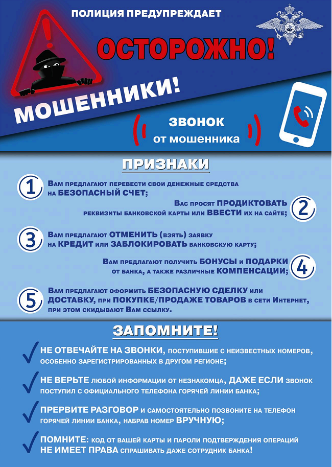 ЗАПОМНИТЕ! Сотрудники банка, работники салонов операторов связи никогда НЕ СПРАШИВАЮТ ПО ТЕЛЕФОНУ КОДЫ ИЗ СМС И ПЕРСОНАЛЬНЫЕ ДАННЫЕ БАНКОВСКИХ КАРТ. Не существует такого вида сохранения средств, как внесение наличности через терминал на «резервный» счёт либо перевод на абонентский номер. Ни в коем случае не устанавливайте в своем смартфоне либо компьютере какие-либо программы по просьбе неизвестного лица. Также при прекращении пользования абонентским номеров необходимо отвязать его от всех банковских приложений и личного кабинета портала Госуслуг.